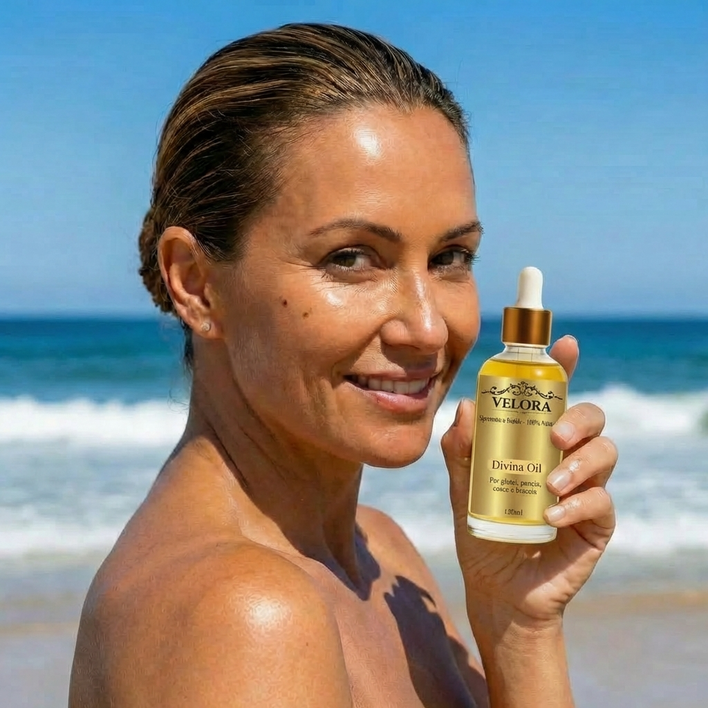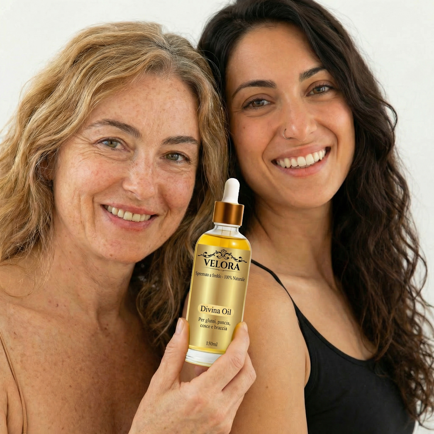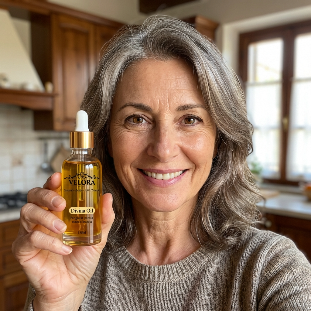 Pelle liscia. Tonica. Luminosa. Non è un sogno, è Velora Divina Oil. La tua arma segreta per ritrovare sicurezza, sensualità e amore per il tuo corpo. A 50, 60 o 70 anni. L'età non conta. Tu sì.